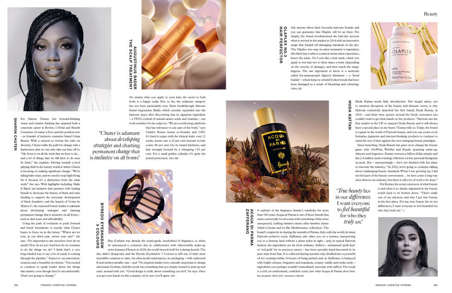 A selection of beauty openers and layouts from various Harrods magazines. These designs showcase the integration of imagery and typography to highlight the latest beauty trends and products.